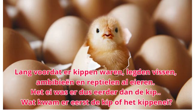 Met Pasen vraag ik me het bovenstaande altijd weer af; wat was er eerder, de kip of het ei? Wie het weet mag het zeggen.